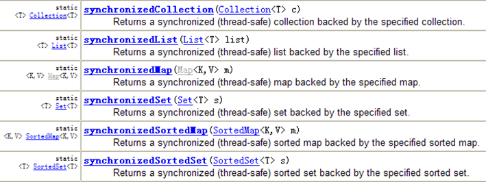 说明:ArrayList和HashMap都是线程不安全的,如果程序要求线程安全,我们可以将ArrayList、HashMap转换为线程的。使用synchronizedList(List list) 和 synchronizedMap(Map map)