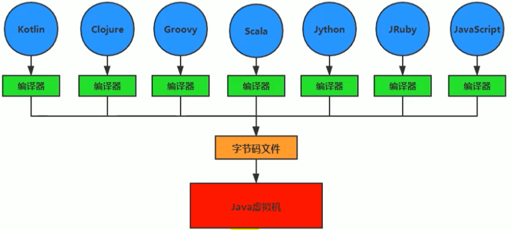 每个语言都需要转换成字节码文件,最后转换的字节码文件都能通过Java虚拟机进行运行和处理
