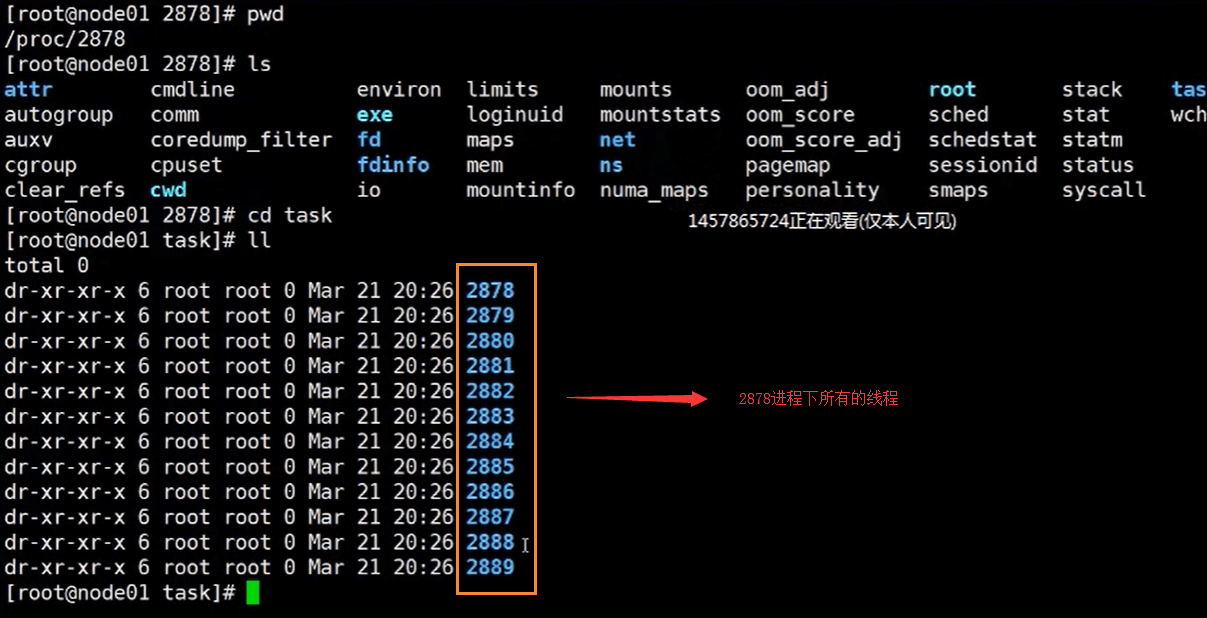 我们可以看到2878进程下的,通过查看task目录,可以看到所有线程数
