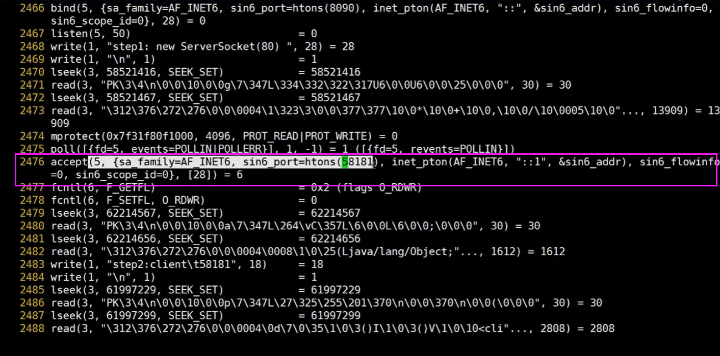 我们查看系统调用,发现通过系统调用接收了一个58181端口号的请求,在前面我们还能够看到5,这个5其实就是对应的上图里面的socket,走的是ipv4。
