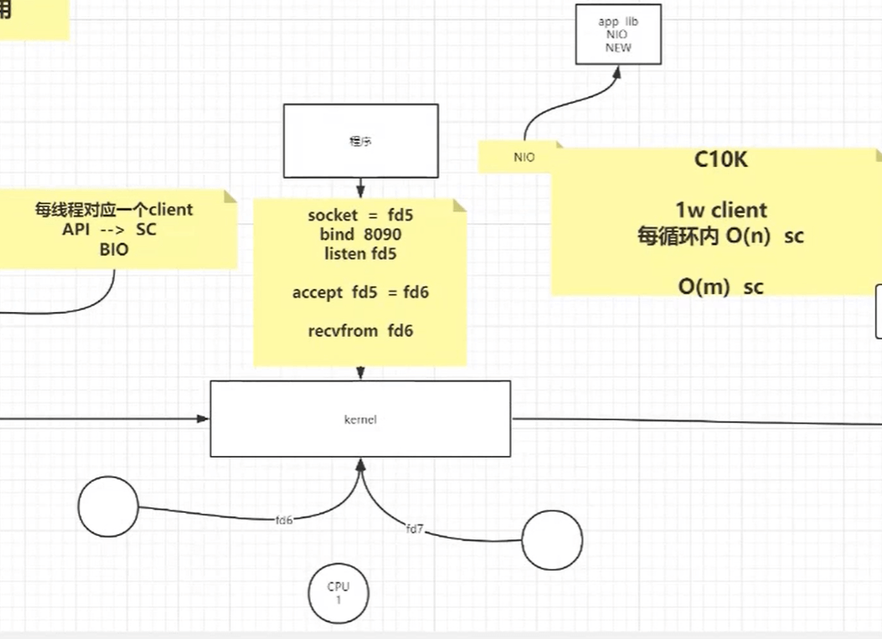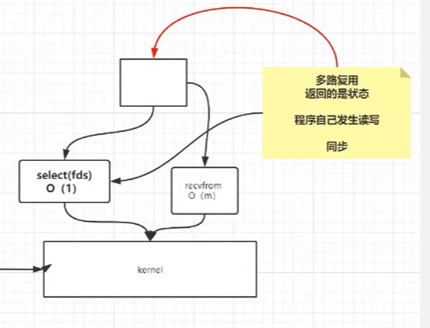 这个时候,我们就不需要遍历10K个客户端了,而是把我们的fds文件发送给内核,然后内核去判断最后需要连接诶的客户端,这样就不用遍历全部的了。所以这里的Select就是多路复用器,通过多路复用返回的是状态,然后我们需要程序去判断这些状态。